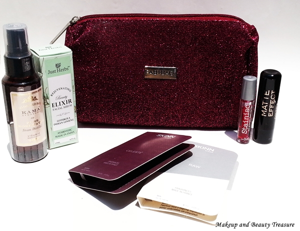 The bag is glittery dark maroon in color that looks glam and gorgeous. My wedding is NEAR and these bags will definitely be my companion in my travels. It comes with a card that tells you what products are included in the bag and a Fabpost with details of products and various other brands! As always the bag comes with 2 full sized and 3 sample sized products.